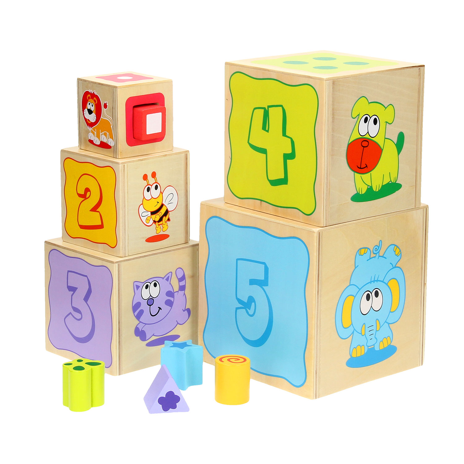Met deze 5 stapelblokken en vormenstoof en 5 verschillende vormen is er genoeg om te ontdekken. Zijn alle vormen herkend, dan begint de uitdaging om ze op de juiste manier te stapelen en door de juiste opening terug in de vormenstoof te stoppen.
